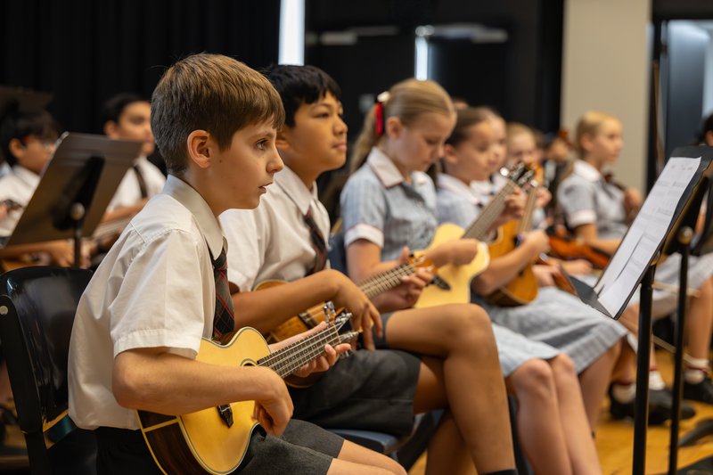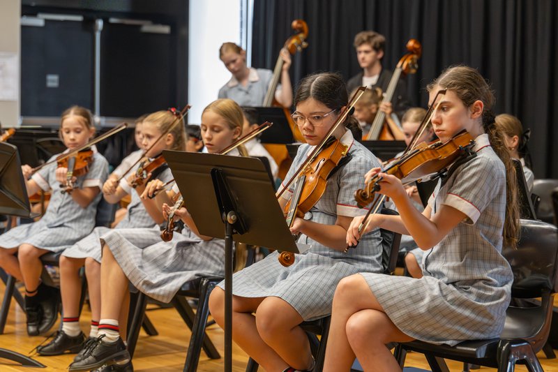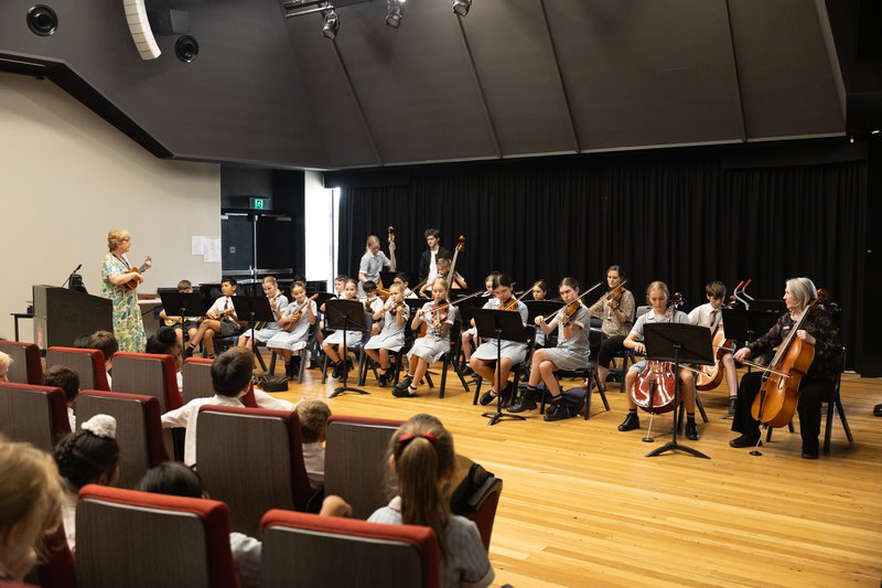 Year 5 Music students learn to play string instruments during their Music classes. They choose from Ukulele, Violin, Cello and Double Bass. To celebrate their hard work and achievements this year each class put on a concert for Kindergarten and Year 1 classes. They played four songs, finishing with “Jingle Bells”. Some of the younger students joined in singing and playing sleigh bells. It was exciting for Year 5 to perform together after learning their instruments separately all year and to have a real life audience.