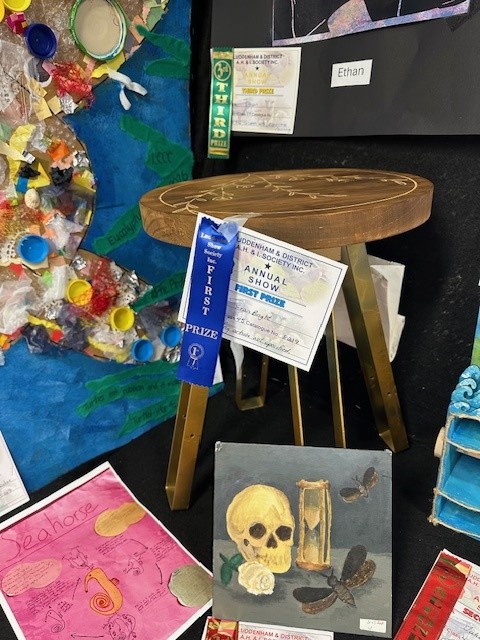 Evan B (Year 10) received First Prize for both a timber stool he designed and built and an innovative seatbelt invention he created.